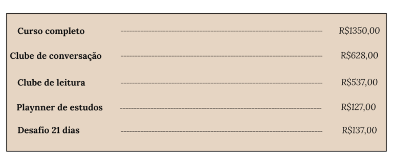 Esse seria o valor total de cada produto vendido separadamente, e que facilmente poderia custar muito mais, visto que é um curso completo com meu acompanhamento e suporte pedagógico.