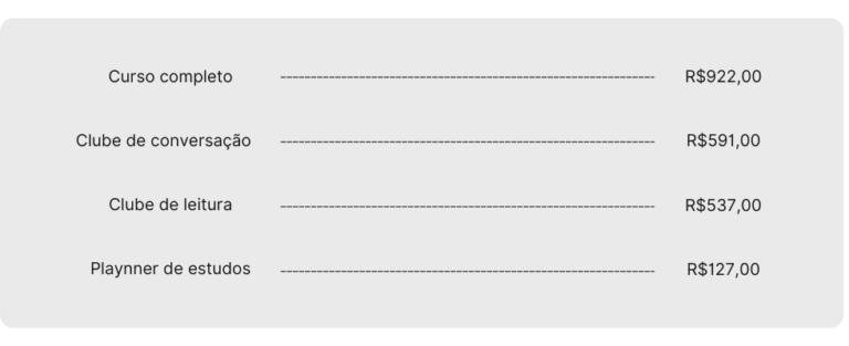 Esse seria o valor total de cada produto vendido separadamente, e que facilmente poderia custar muito mais, visto que é um curso completo com meu acompanhamento e suporte pedagógico.