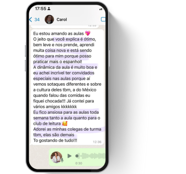 Sendo professora de inglês, Carina já havia estudado espanhol em outra escola, mas não conseguiu se adaptar. Ao fazer parte da nossa comunidade, encontrou exatamente o que procurava.