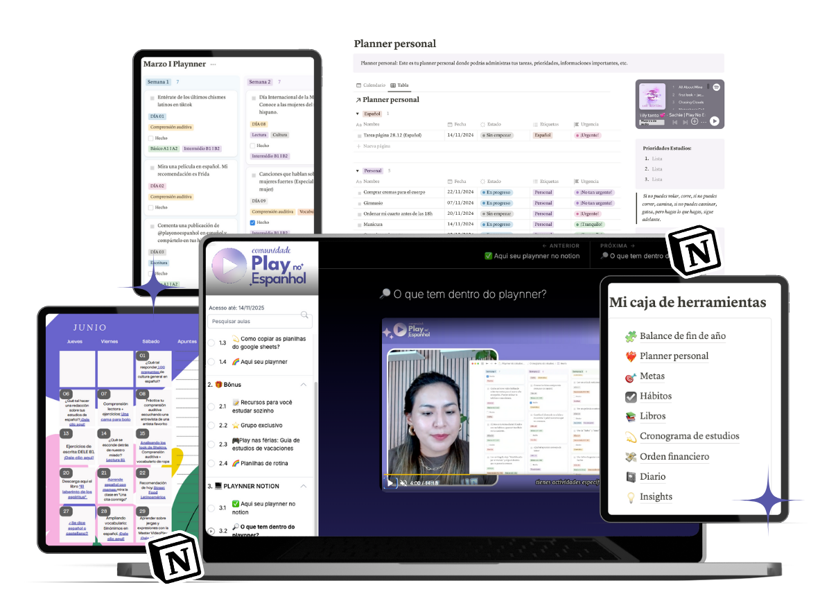 O curso de espanhol é organizado em temporadas, abordando os níveis básicos A1/A2 na primeira temporada, seguidos pelo nível intermediário B1/B2 na segunda temporada, e o avançado C1/C2 na terceira temporada. Cada temporada é composta por 10 módulos, e cada módulo inclui 10 aulas. Além das aulas, você terá acesso a uma variedade de recursos, como o clube de conversação, aulas de revisão, clube de leitura, biblioteca, aulas com música, um curso completo de gírias e um planner de estudos para acompanhar suas atividades diárias ao longo do ano em total tem mais de 350 aulas disponíveis.